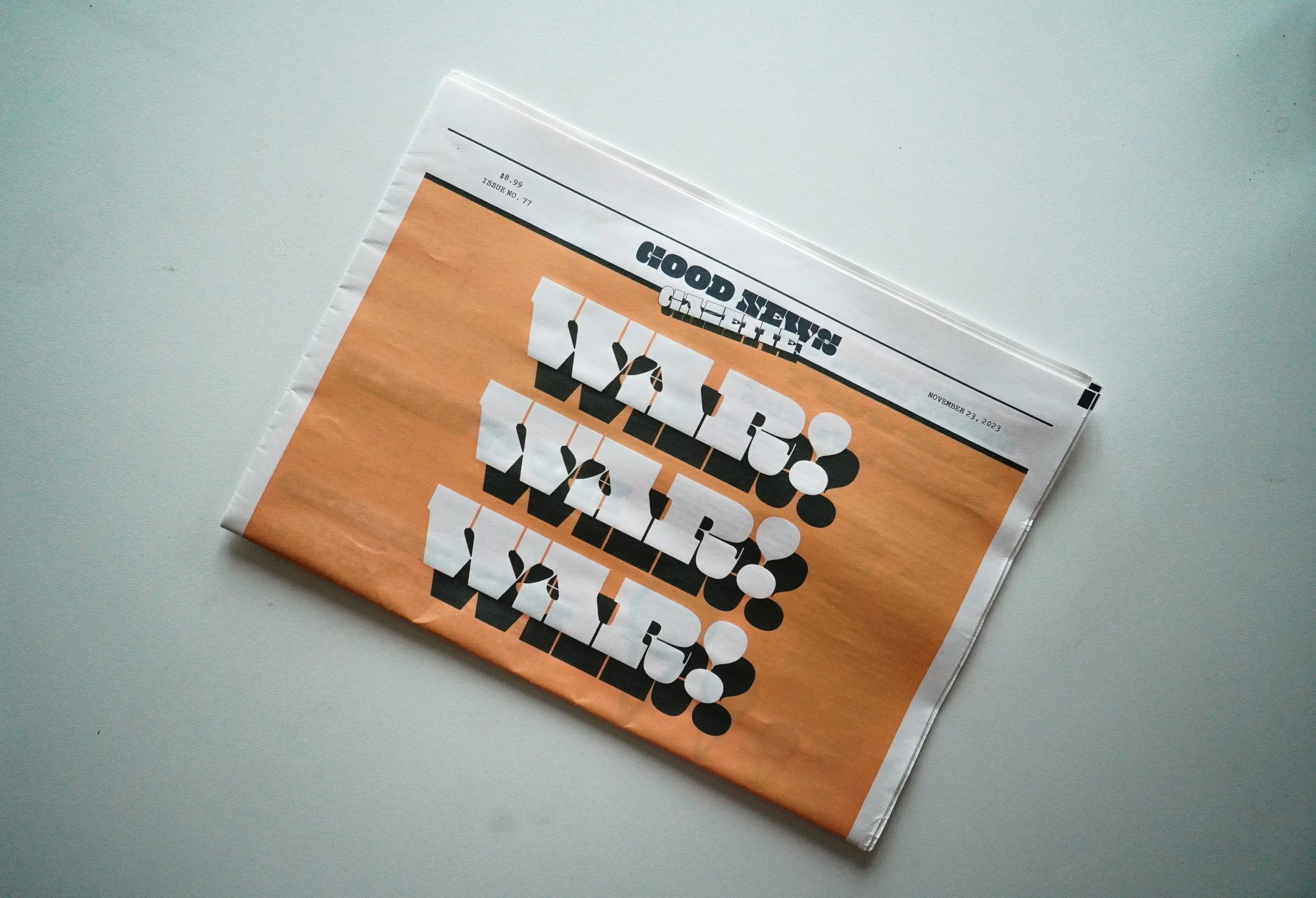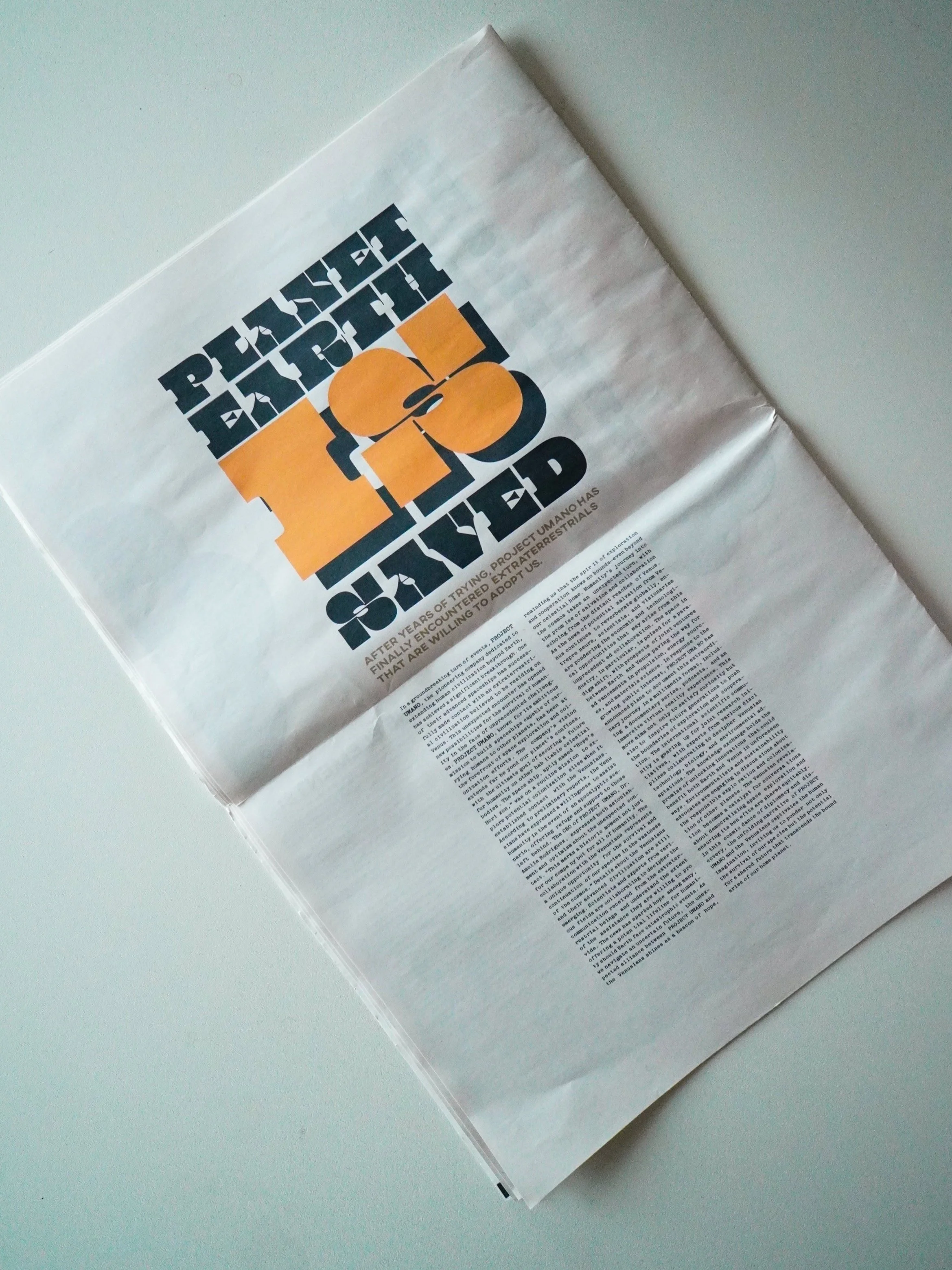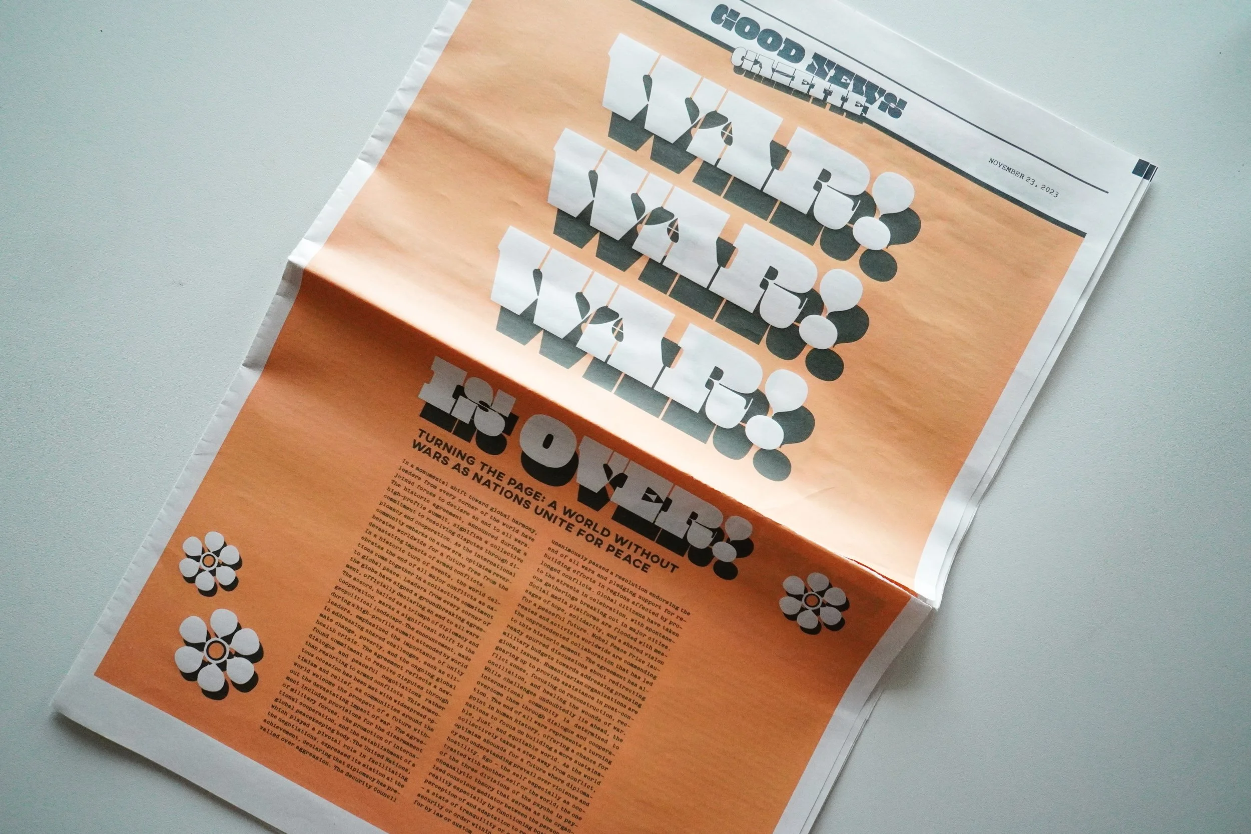The Good News Gazette was a project focusing on newspaper layouts using only text and no images. All the stories in the paper were generated by AI with the prompt to “write a story about the best news in the world”, with a topic of your choice.